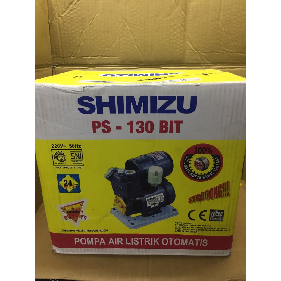 Shimizu ps130bit merupakan pompa air produksi shimizu yang mempunyai daya hisap dan daya dorong kuat. Shimizu ps 135 e mesin pompa air otomatis. Pompa air ini sangat cocok digunakan untuk aplikasi untuk dorong dari penampungan bawah menuju penampungan atas (tandon air). Pompa air sumur dangkal ini memiliki kapasitas sebesar 18 liter / menit pada total head 10 meter, 10 liter/menit pada total head 22 meter. Konsumsi daya 150 w, kapasitas output 17 l/min, discharge head 40 m, suction head 9 m. Pompa air shimizu ps 135 e: Pompa air listrik shimizu ps 230 bit (ori & termurah ): Pompa ini merupakan pompa sumur dangkal otomatis 125 watt yang memiliki daya sedot yg kuat kerjanya praktis dan serba ekonomis. Kami memiliki service center & authorized service center yang tersebar luas di seluruh indonesia sehingga memudahkan masyarakat jika ingin memperbaiki pompa airnya. Daftar harga shimizu 130 bit terbaru juli 2021. Pompa air shimizu memiliki kumparan motor yang terbuat dari bahan murni tembaga dengan daya dorong maksimal mencapai 40 meter dan mengonsumsi. Saat ini sudah ada lebih dari 10 macam model atau type unit pompa merk shimizu yang telah beredar dan sangat disukai oleh masyarakat karena sudah teruji dan terbukti kualitasnya. Small pressure tank ini juga dilapisi dengan pelapis tahan karat.
